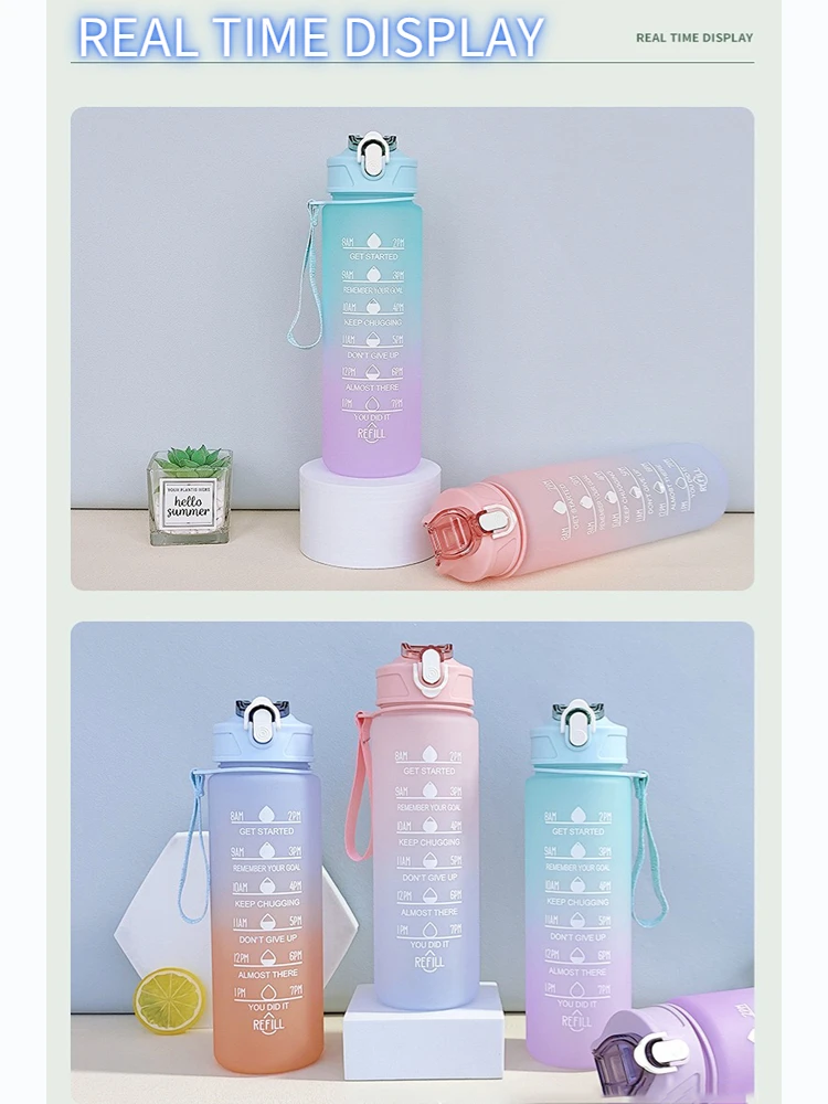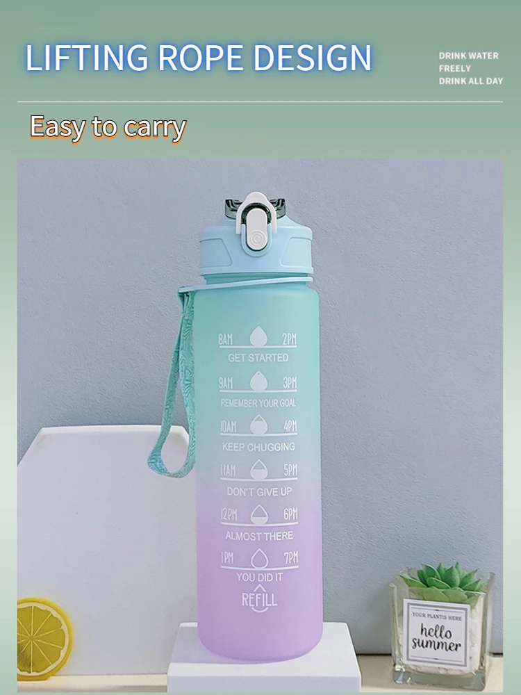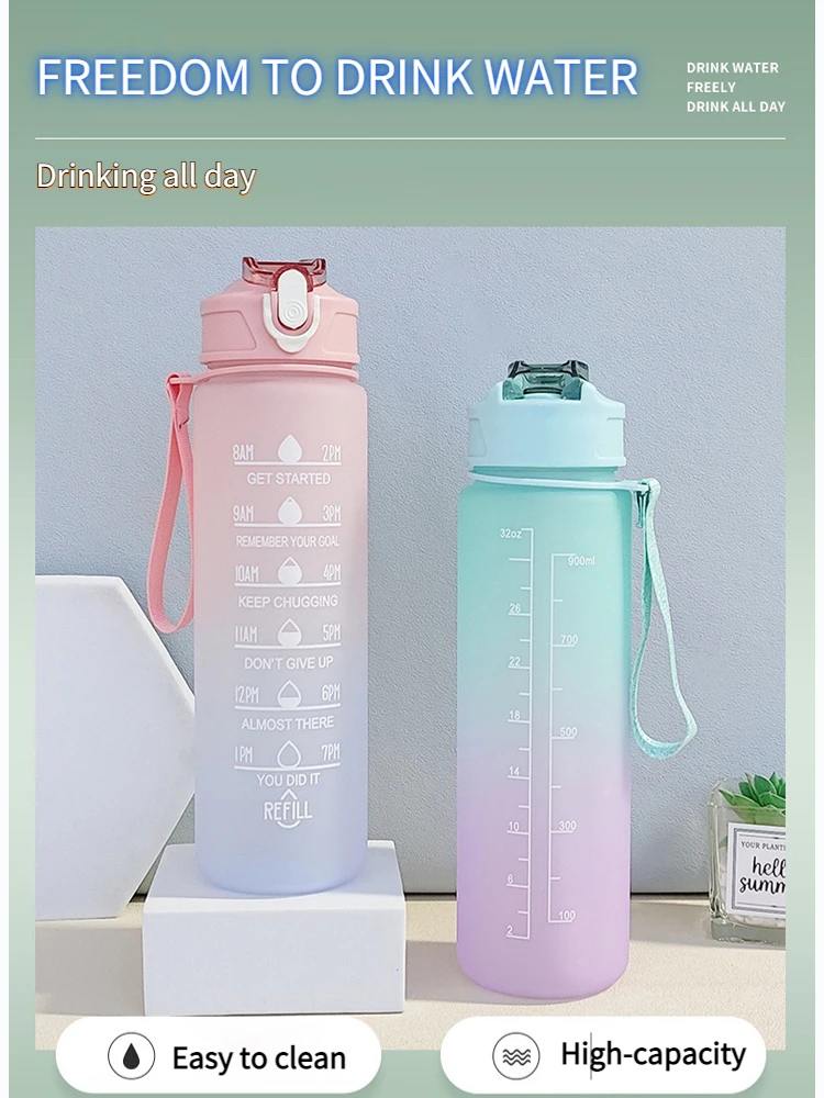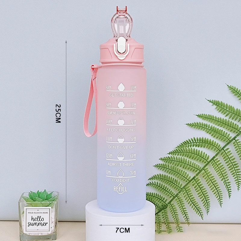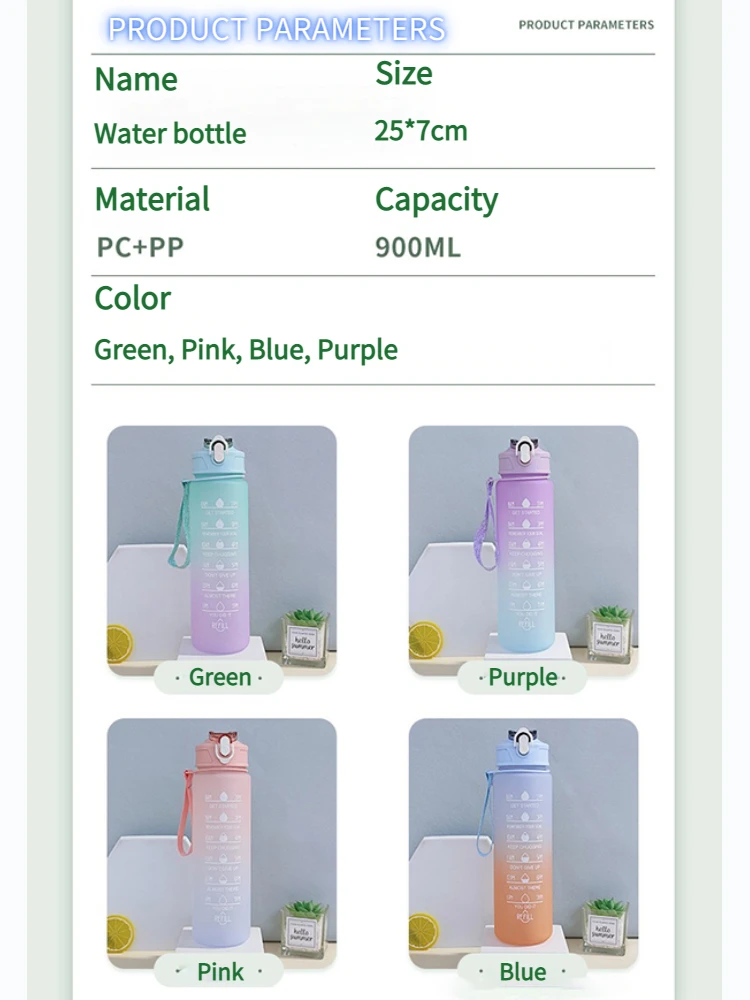 Garrafa com Capacidade para 900ml Tampa que abre com um clique Com borracha para vedação (Pode ficar na horizontal que não vaza) Dimensões : Altura 25cm, Largura 7cm